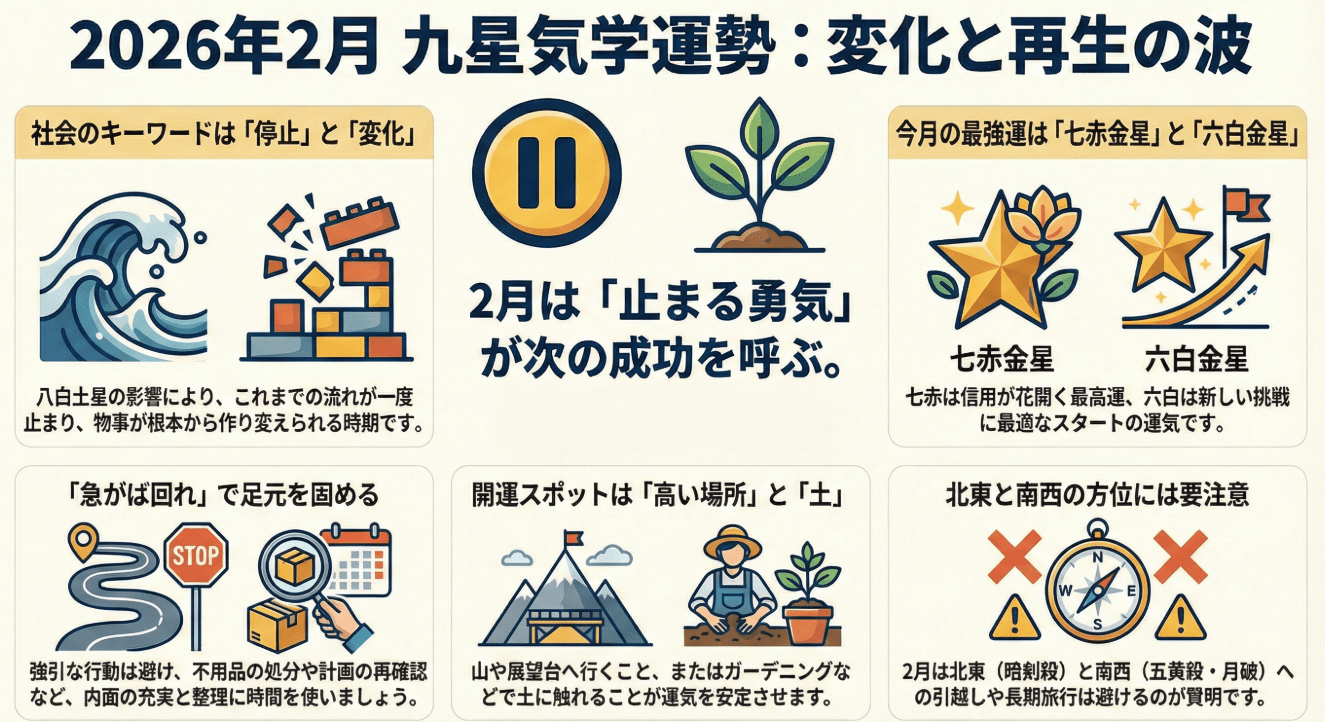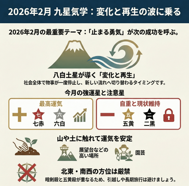 「2026年2月の九星気学」に基づき、社会全体の流れから各九星別の詳細な運勢、そして運気を引き寄せるための開運アクションまで網羅的に解説します。今月の運勢を知り、最善の行動タイミングを掴みましょう。