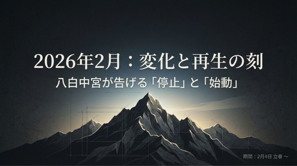 2026年2月は、八白土星が中心(中宮)に座ります。八白土星は「山」「停止」「変化」「継承」を象徴する星です。これまでの流れが一旦止まり、新しい形へと脱皮していくようなエネルギーが社会全体に流れます。