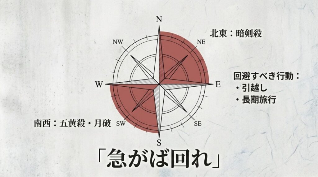 今月は、北東に「暗剣殺(あんけんさつ)」、南西に「五黄殺(ごおうさつ)」と「月破(げっぱ)」が重なります。これらの方位への引越しや長期旅行には注意が必要です。また、全体として「急がば回れ」の精神が、不慮のトラブルを回避する鍵となります。