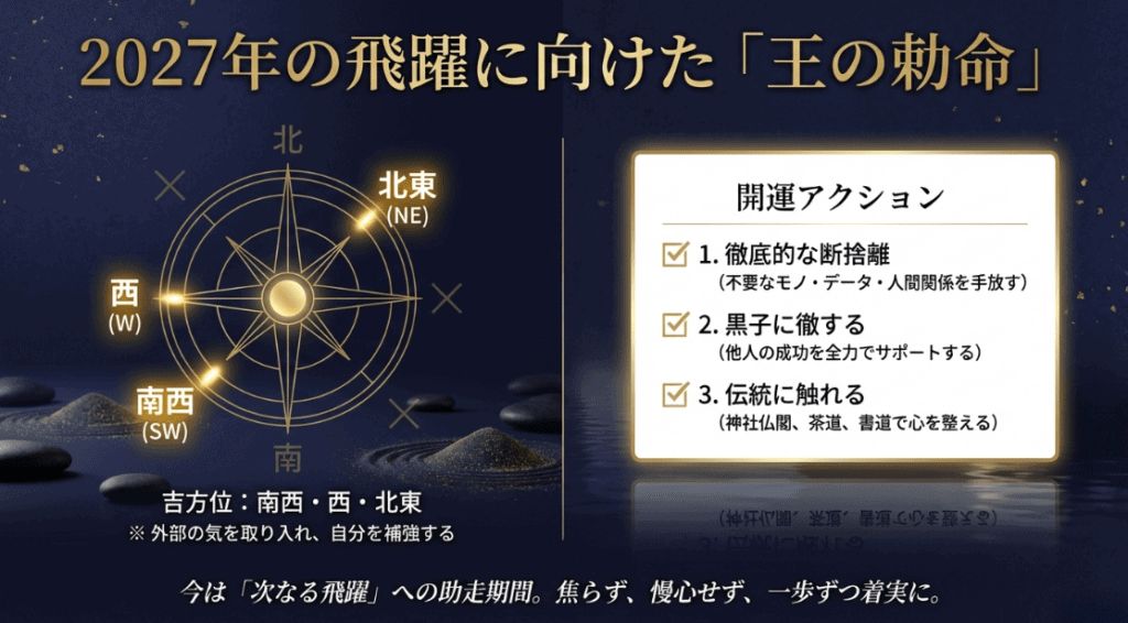 中宮の年は「整理」の年です。クローゼットの中身、PC内のデータ、そして腐れ縁のような人間関係に至るまで、自分にとって不要になったものを手放してください。スペースを空けることで、来年以降に舞い込む新しい幸運を受け取る準備が整います。