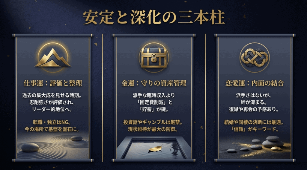 金運に関しては、波の少ない「安定」の一年となります。大きな臨時収入は期待しにくいですが、無駄遣いを抑え、堅実に資産を守ることができる時期です。