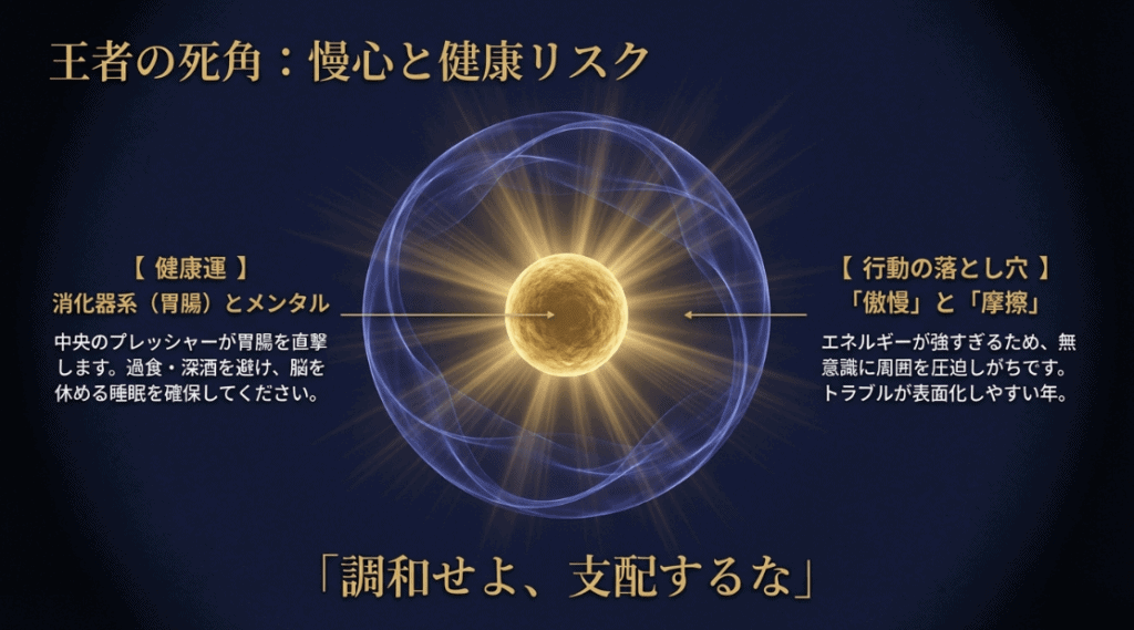 中宮(五黄土星の場所)に位置するため、特に「胃腸などの消化器系」への負担がかかりやすいです。過食や深酒を避け、規則正しい食生活を心がけてください。また、中央に位置することで受ける精神的なプレッシャーから、自律神経の乱れが生じることもあります。