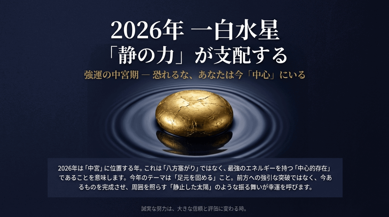 2026年(令和8年)は、九星気学において一白水星が「中宮(ちゅうぐう)」に回座する年です。これは9年周期の運勢の中で一つの節目を迎え、運気がピークに達すると同時に、周囲を8つの星に囲まれる「八方塞がり」とも呼ばれる特殊な状況を指します。