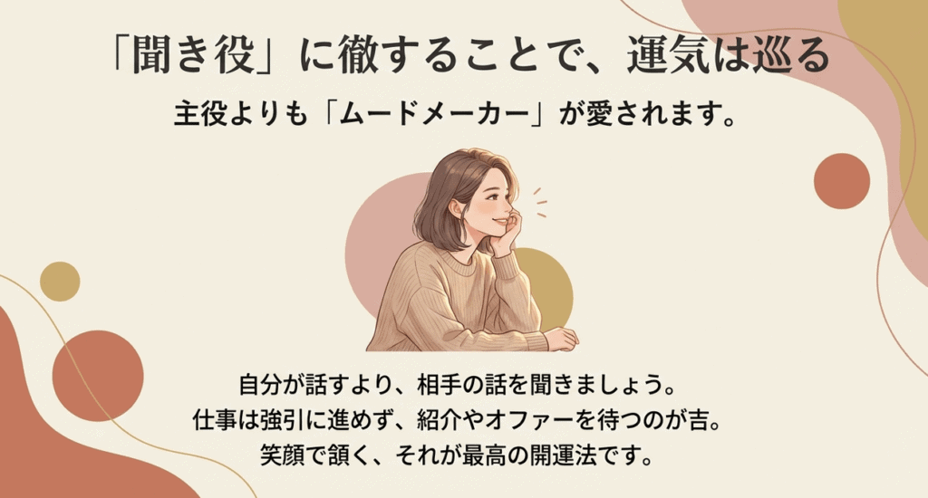 2026年は、攻めの姿勢よりも「受け」の姿勢に幸運が宿ります。自ら強引に動いて転職先を探すより、ヘッドハンティングや知人からの紹介といった「外からもたらされる話」にツキがあります 。もし独立を考えているのであれば、2026年は準備と人脈作りに充て、具体的な行動は専門家や信頼できる目上の人に相談してからにしましょう 。