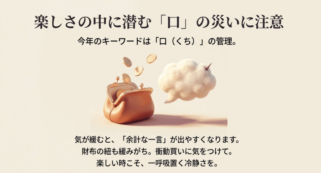 - 奢り過ぎない: 気が大きくなると「ここは自分が」と奢ってしまいがちですが、今年は節度ある付き合いが自身の財を守ります 。