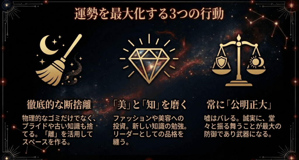 - 1. 「離」の作用を活用し、断捨離を徹底する:物理的なゴミだけでなく、不必要な人間関係、もう使わない知識やプライドを捨てることで、新しい幸運が入るスペースを作ります。