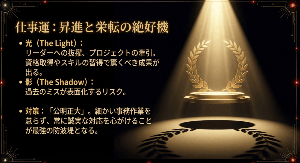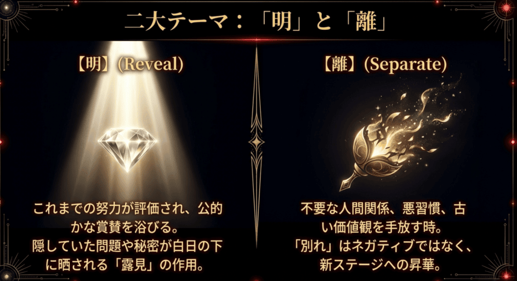 良い点としては、これまで日の目を見なかったプロジェクトや個人の活動が、一気に世の中に認知される可能性が高いことです。特にクリエイティブな仕事や表現活動をしている人にとっては、人生の転機となるような大きな成功を収めるチャンスがあります。一方で注意すべきは、離宮特有の「露見」の作用です。自分では隠しているつもりだった過去のミスや秘密が、ふとしたきっかけで周囲に知れ渡る暗示があります。誠実な対応を心がけていれば恐れることはありませんが、隠し事は禁物です。