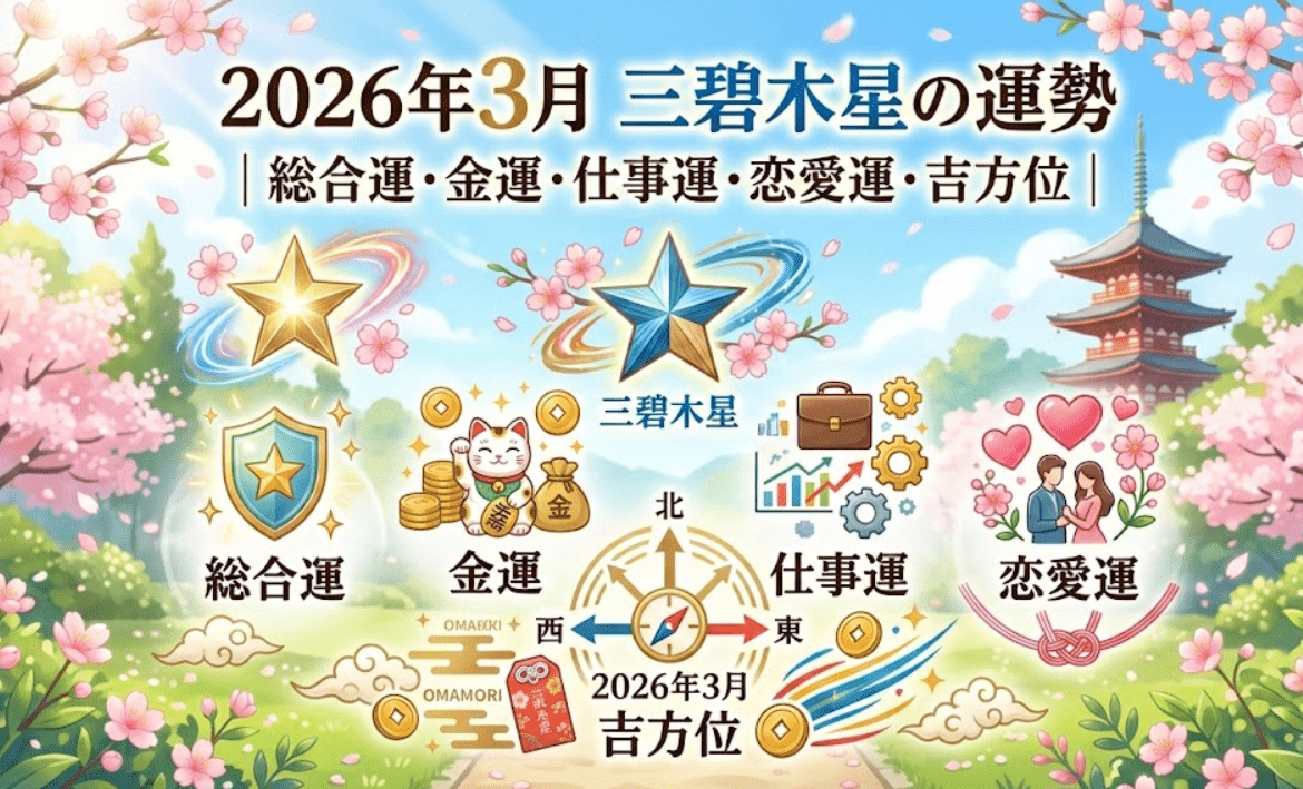 2026年3月 三碧木星 運勢を、坎宮回座・年盤六白金星の影響・被同会九紫火星の作用から専門家視点で解説。総合運、三碧木星 仕事運、三碧木星 金運、恋愛運、健康運、三碧木星 吉方位、注意点と開運アクションまで具体的にまとめます。