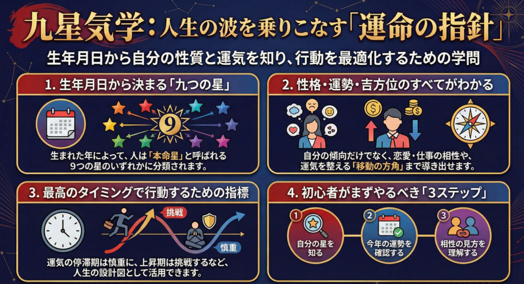 九星気学(きゅうせいきがく)は、生年月日から導き出される「九つの星」をもとに、性格・運勢・相性・吉方位などを読み解く東洋の運命学です。
