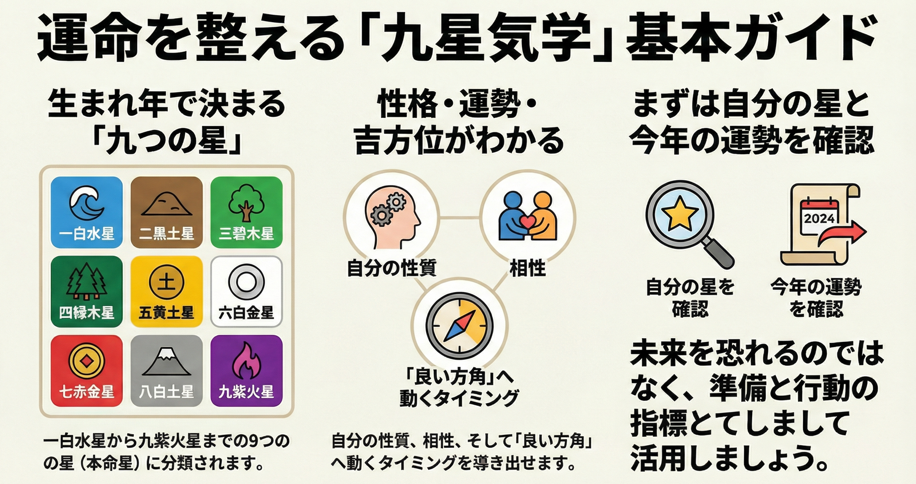 九星気学を学び始めたら、まずは次の3つを知りましょう。