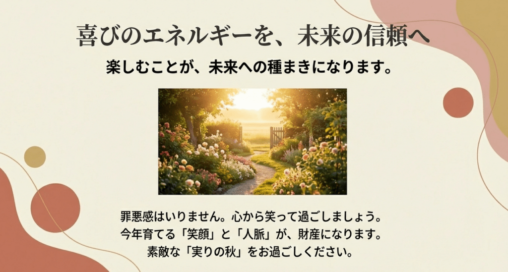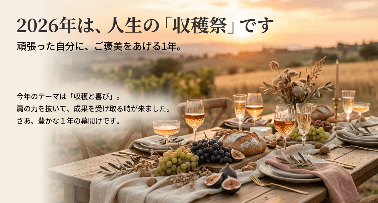 2026年 三碧木星 運勢は、まさに「人生の収穫祭」です。前年までの厳しい戦いを終え、実りを手にする喜びを存分に味わってください。人との交流、美味しい食事、恋のときめき……どれもが2026年のあなたを輝かせるエッセンスとなります。