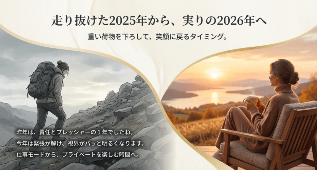 2025年は、天の加護を受けつつも、自分を極限まで追い込んで実績を作る「乾宮」の時期でした 。精神的な緊張感も強かったはずですが、2026年に入るとその緊張が解け、視界がパッと明るくなります 。仕事一辺倒だった生活から、プライベートの充実や人間関係の構築へと関心が移り、フットワークも軽くなるでしょう 。