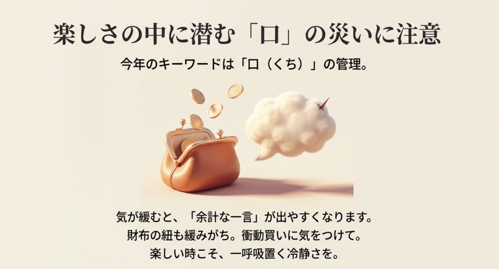 - 奢り過ぎない: 気が大きくなると「ここは自分が」と奢ってしまいがちですが、今年は節度ある付き合いが自身の財を守ります 。