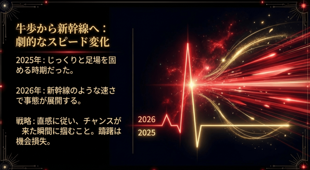 前年との大きな違いは「スピード感」です。2025年は牛歩のような進み方でしたが、2026年は新幹線のような速さで事態が展開します。チャンスが目の前に来た瞬間に掴めるよう、常にアンテナを張っておく必要があります。また、2026年は丙午(ひのえうま)の年でもあり、社会全体が非常に活発で激動の様相を呈します。五黄土星の持つ強力なリーダーシップを、周囲を振り回すためではなく、明るく照らすために使うことが運気アップの秘訣です。