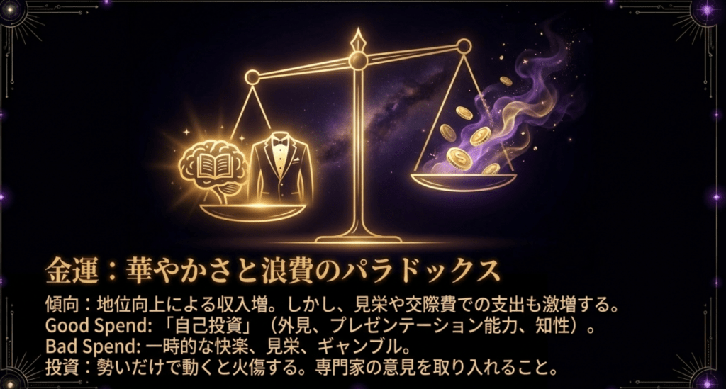2026年 五黄土星 運勢における金運は、非常に華やかですが「出入りが激しい」のが特徴です。地位の向上に伴う収入増が期待できる一方で、見栄を張るための支出や、交際費、高級品の購入といった浪費が増える傾向にあります。今年は「自分への投資」にはお金をかける価値がありますが、単なる贅沢品や一時的な快楽のための出費は、後の自分を苦しめることになります。