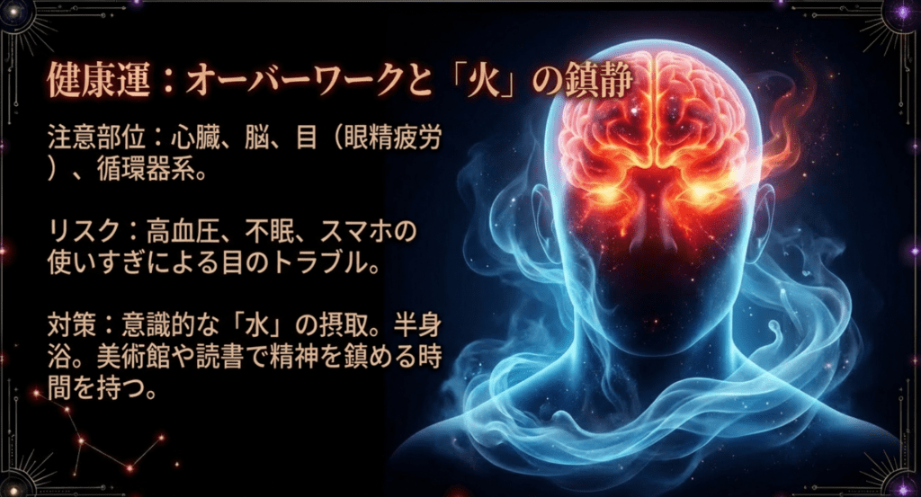 ストレス発散には、静かに読書を楽しんだり、美術館を訪れたりと、精神的な満足度を高める活動が有効です。また、火のエネルギーを鎮めるためには、良質な水を積極的に摂取し、半身浴などでリラックスする時間を持つことが推奨されます。感情が激昂しやすい年は、深呼吸を習慣にすることで自律神経のバランスを整えましょう。大きな病気というよりは、突発的な事故や怪我、熱を伴う疾患に気をつけたい1年です。定期的な健康診断を受け、自身の体の変化に敏感になってください。