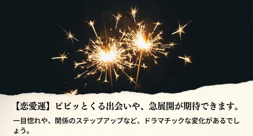 恋愛運は非常に華やかで、ドラマチックな展開が期待できます。震宮の影響で、一目惚れや衝撃的な出会い、あるいはSNSなどのデジタルな場を通じた縁が急速に発展しやすい年です。フリーの方は、趣味の集まりやイベントなど、賑やかな場所に積極的に足を運んでみてください。意中の人がいる場合は、ストレートなアプローチが最も効果的です。回りくどい態度は逆効果になりかねません。