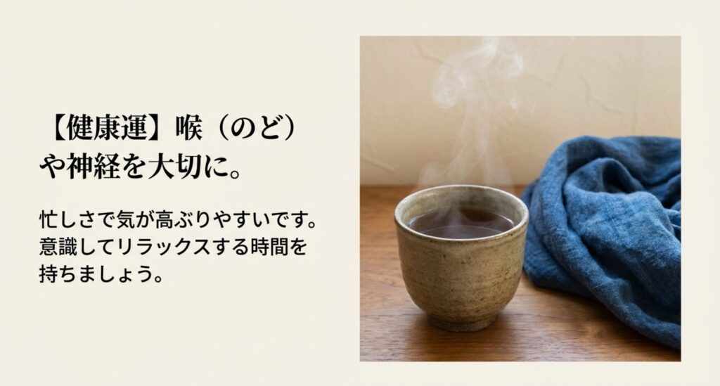 健康面で注意すべきは、震宮の担当部位である「肝臓」「神経系」「足」「喉」です。エネルギーが過剰になりやすいため、オーバーワークによる自律神経の乱れや、睡眠不足が懸念されます。また、急ぎすぎて足元を疎かにし、捻挫や怪我をするリスクも。喉を痛めやすいため、乾燥対策やうがいの徹底は欠かせません。