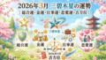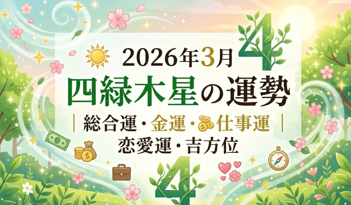 結論から申し上げますと、2026年3月の四緑木星は、「外では笑顔で交流を楽しみつつ、内では着実に基盤を固める」ことが開運の鍵です。先急がず、周囲への感謝と丁寧な対応を心がけることで、2026年後半の飛躍に向けた強固な土台を築くことができるでしょう。自分の本命星が四緑木星であることを再確認したい方は、こちらの「本命星の出し方」を参考にしてください。